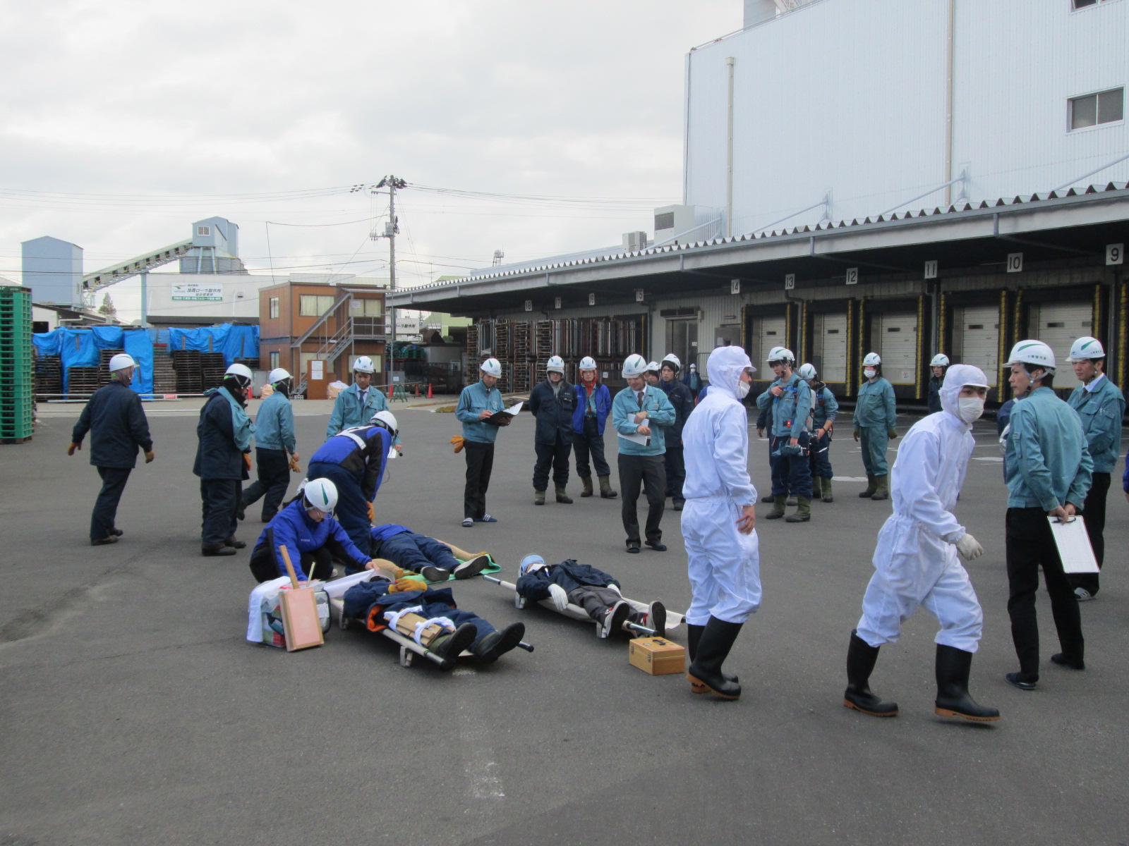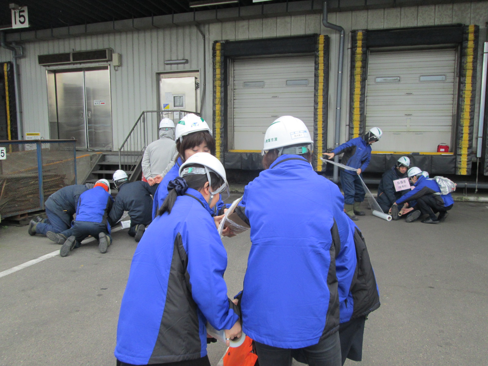 次の写真はケガ人が出た時の対応方法をグループに分かれて実践している時のものです。現場にある備品を使って応急処置をしています。