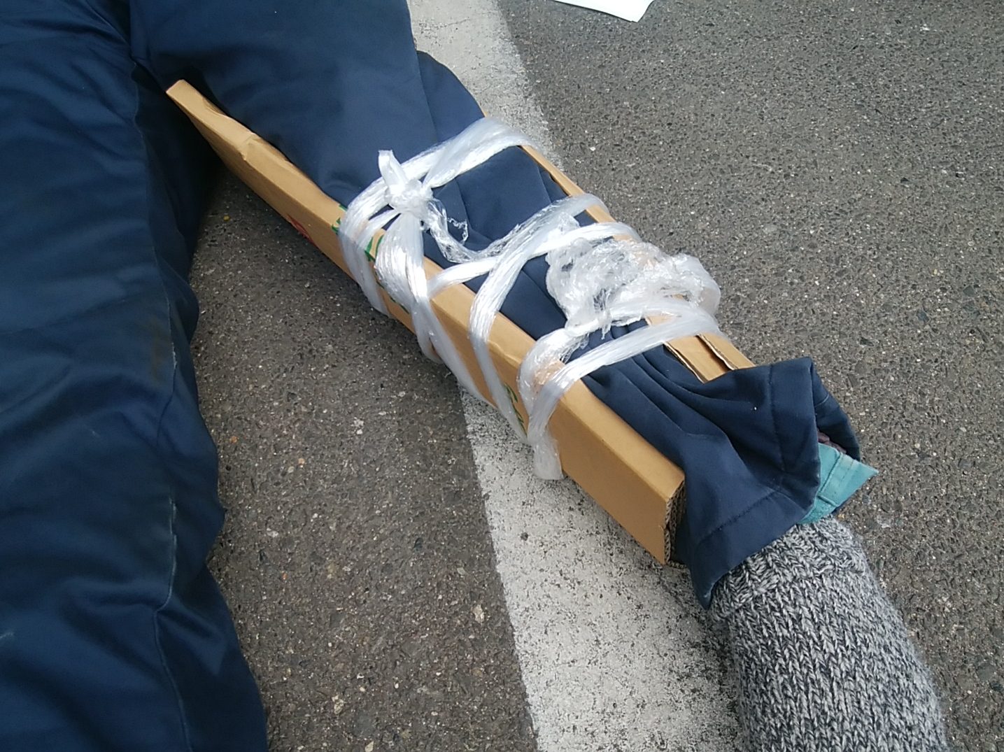 次の写真はケガ人が出た時の対応方法をグループに分かれて実践している時のものです。現場にある備品を使って応急処置をしています。
