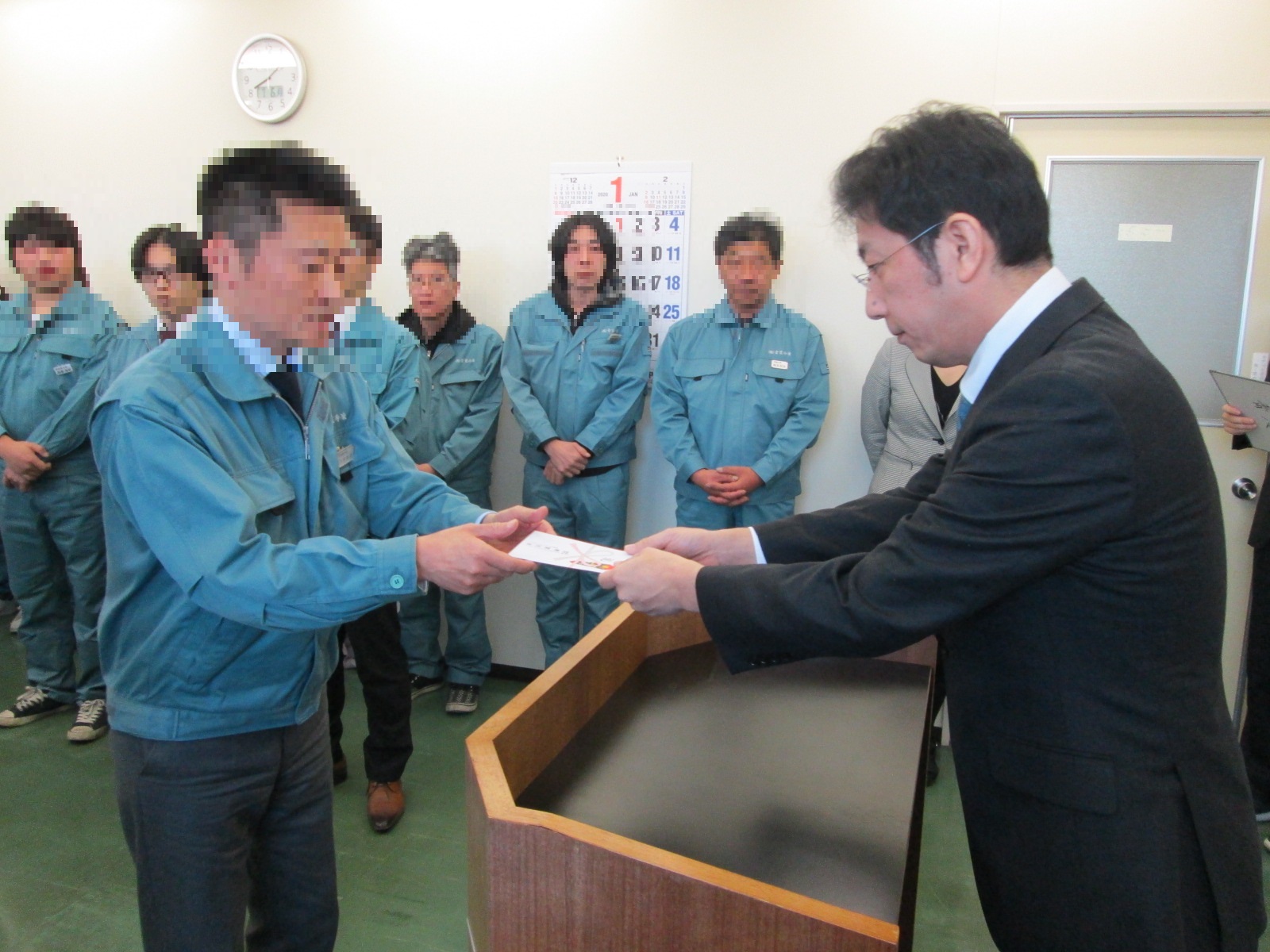 今年も仕事始めとなる1月6日に、全社員が集まる朝礼を行いました。 社長からの訓辞では、変わりやすい社会情勢と当社の対応についてお話がありました。 あ 下の写真は朝礼後に行った従業員への表彰式の様子です。今年は勤続年数が10年と30年の社員2名を表彰しました。 あ 当社は安全第一で努めて参りますので、本年も宜しくお願い致します。
