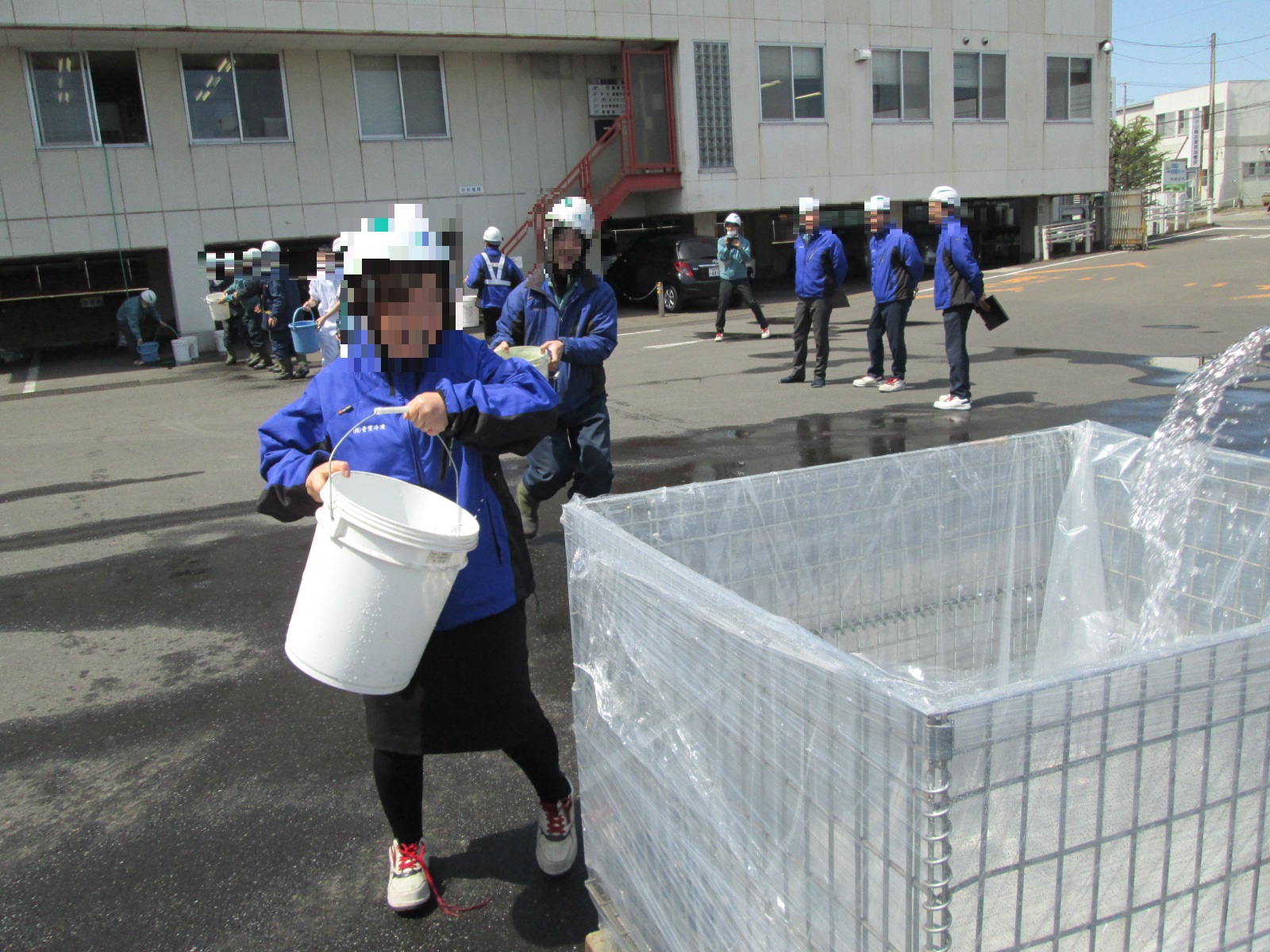 今回初の試みとなるバケツリレーを行いました。消火栓が使えなかった場合に行う初期消火の大変さを体感しました。