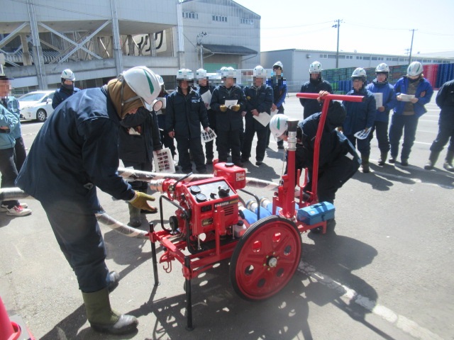 下の写真は、仙台港物流センターで移動式ポンプの使い方を学んでいる様子です。手順書を基に、ポンプの取り付け方とエンジンの始動方法を共有しました。