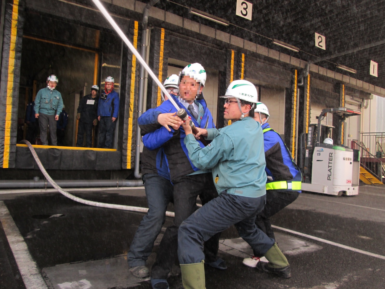 下の写真は、仙台東物流センターでの消火栓を使った放水訓練の様子です。