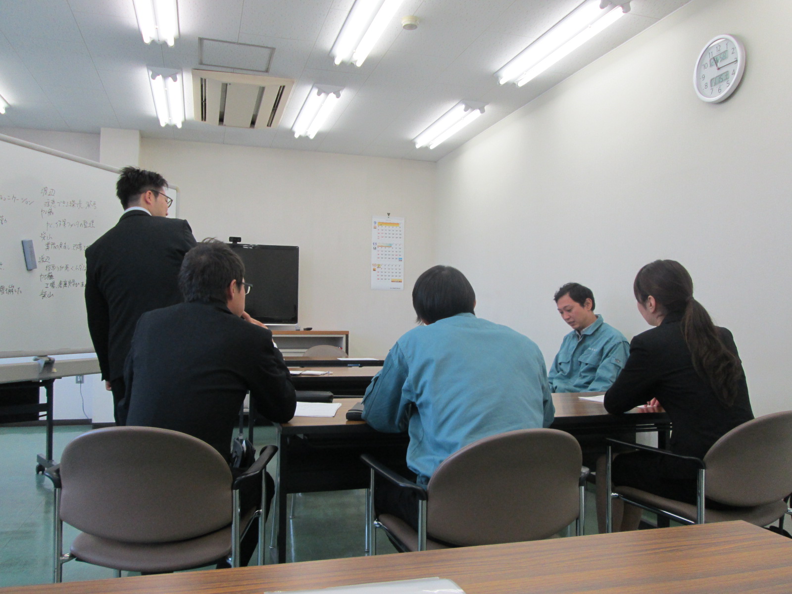 下の写真は入社して半年の実務を経て、それぞれが日常業務で感じている事について話し合っている時の様子です。1つの課題に対して意見を出し合い、よりよい職場にしていく為にはどうしたらいいのか考えています。