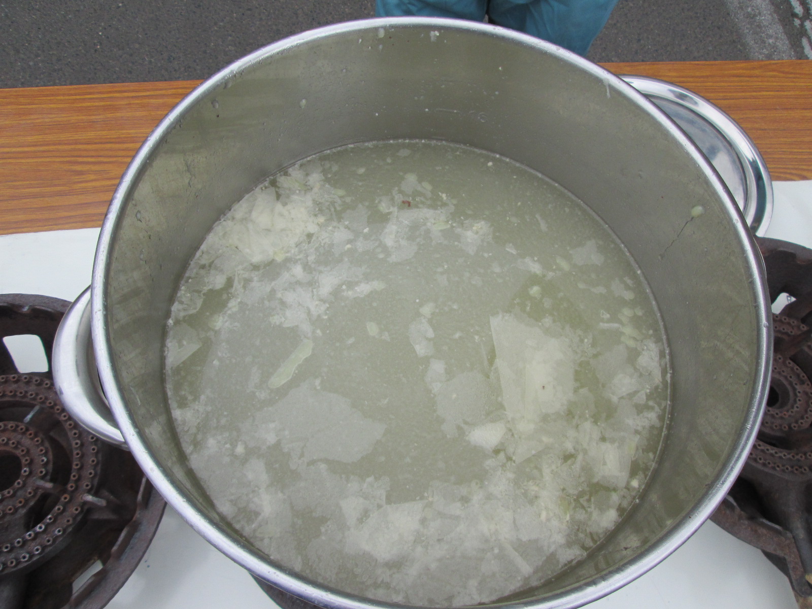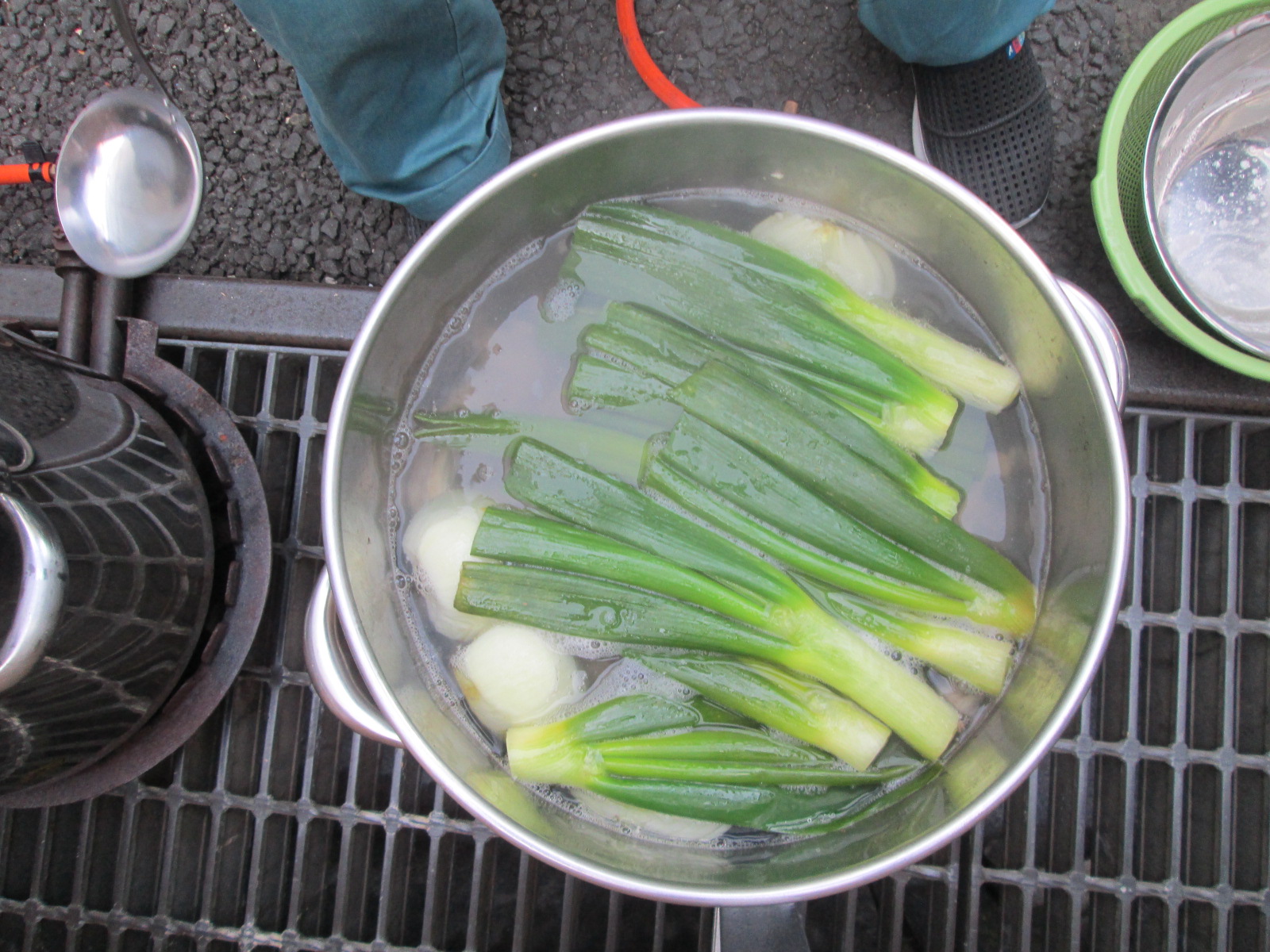 下の写真は、事前準備でラーメンのスープを作っている時のものです。鶏ガラ、ネギ、玉ねぎを使って本格的なラーメンを目指しています。